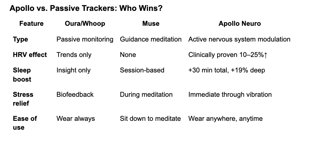✅ If you’re done with trackers that just “tell you”—and want active, immediate stress relief and measurable gains in HRV and sleep, Apollo is unique in the wearable space.